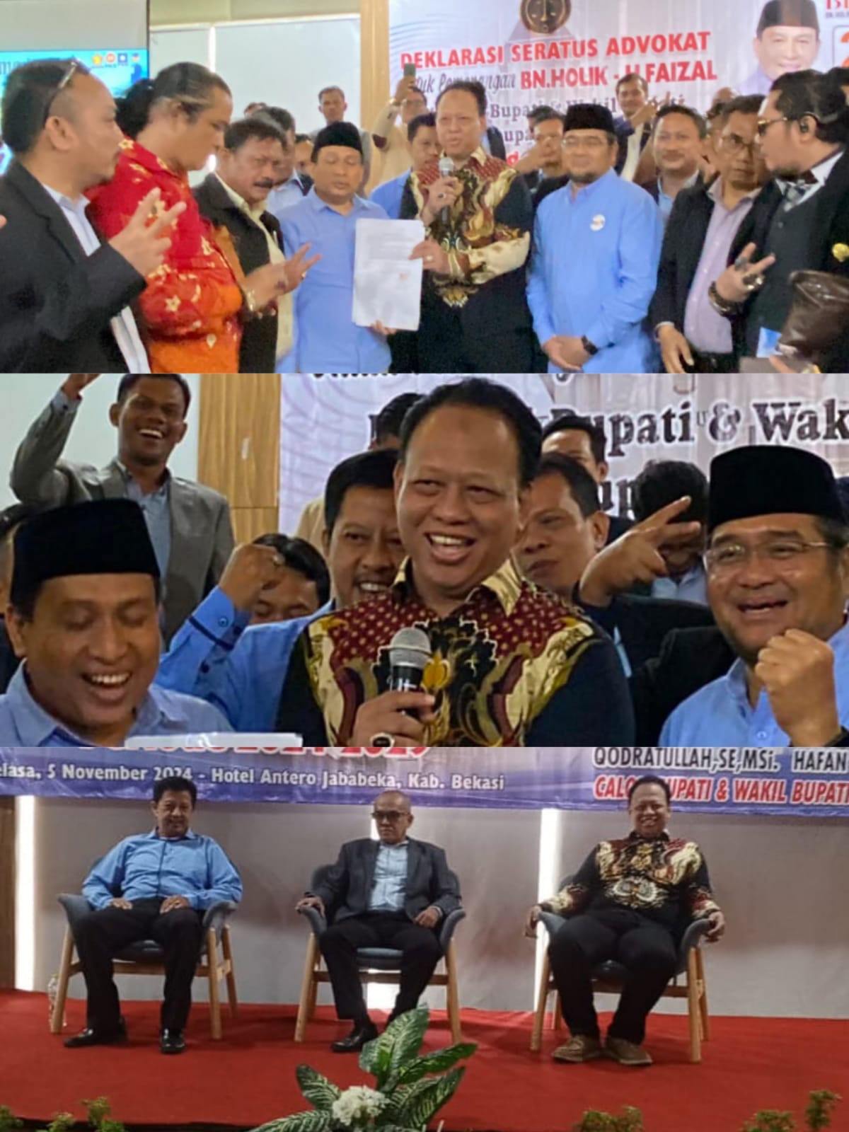 Kabupaten Bekasi – Sebanyak 100 advokat di Kabupaten Bekasi secara resmi menyatakan dukungan mereka kepada pasangan calon Bupati dan Wakil Bupati Bekasi, BN Holik Qodratulloh dan H. Faizal Hafan Farid. Deklarasi tersebut berlangsung di Hotel Antero Jababeka pada Selasa, 5 November 2024.