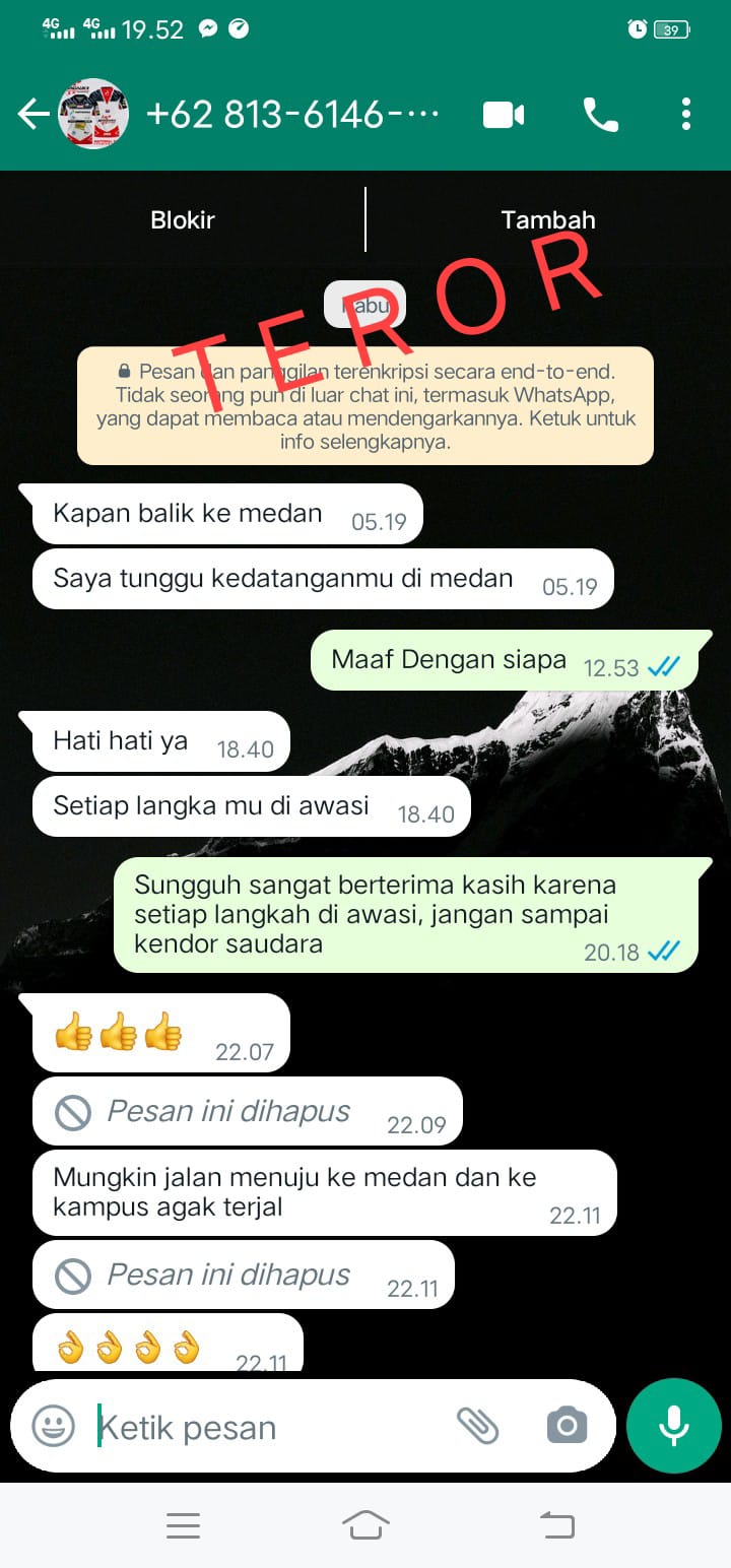 Tidak sampai disitu, peneror gelap tersebut juga menanyakan mahasiswa tersebut kapan pulang ke Medan, tempat mahasiswa itu berkuliah.