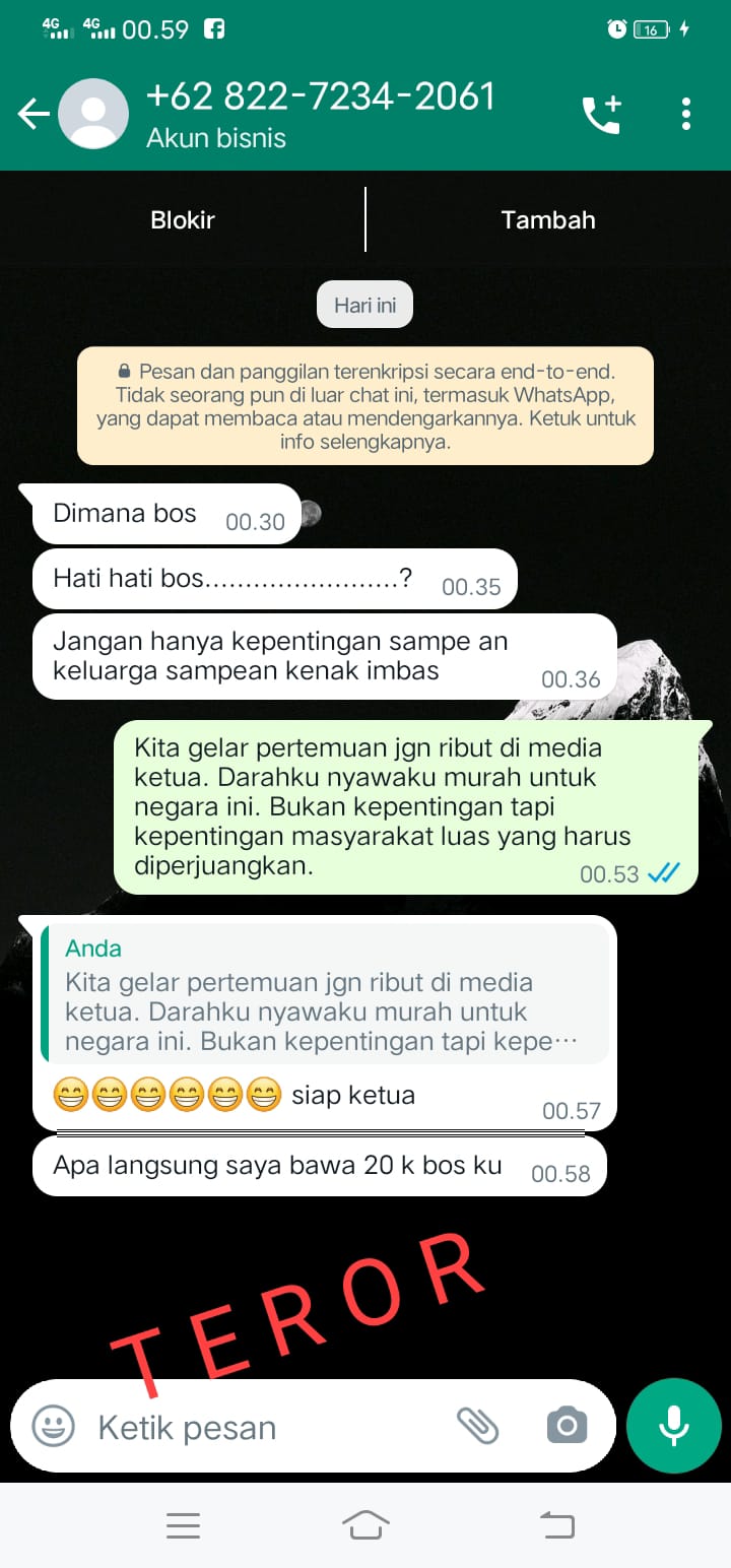 “Apa langsung saya bawa 20 K bos ku,” demikian isi chat peneror gelap itu.