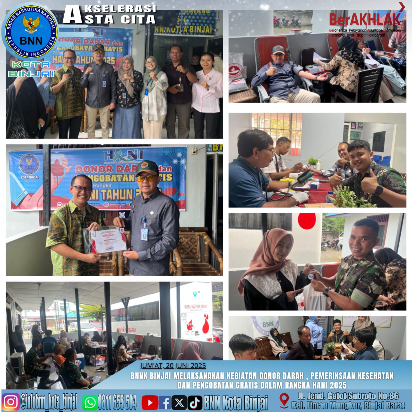 Binjai, Suaramassa.co.id – Dalam rangka menyambut peringatan Hari Anti Narkotika Internasional (HANI) Tahun 2025, Badan Narkotika Nasional (BNN) Kota Binjai menggelar kegiatan donor darah, pemeriksaan kesehatan, dan pengobatan gratis pada Jumat, 20 Juni 2025, yang bertempat di halaman Kantor BNN Kota Binjai. Acara dimulai pukul 09.00 WIB hingga selesai dan berlangsung lancar serta penuh antusiasme.