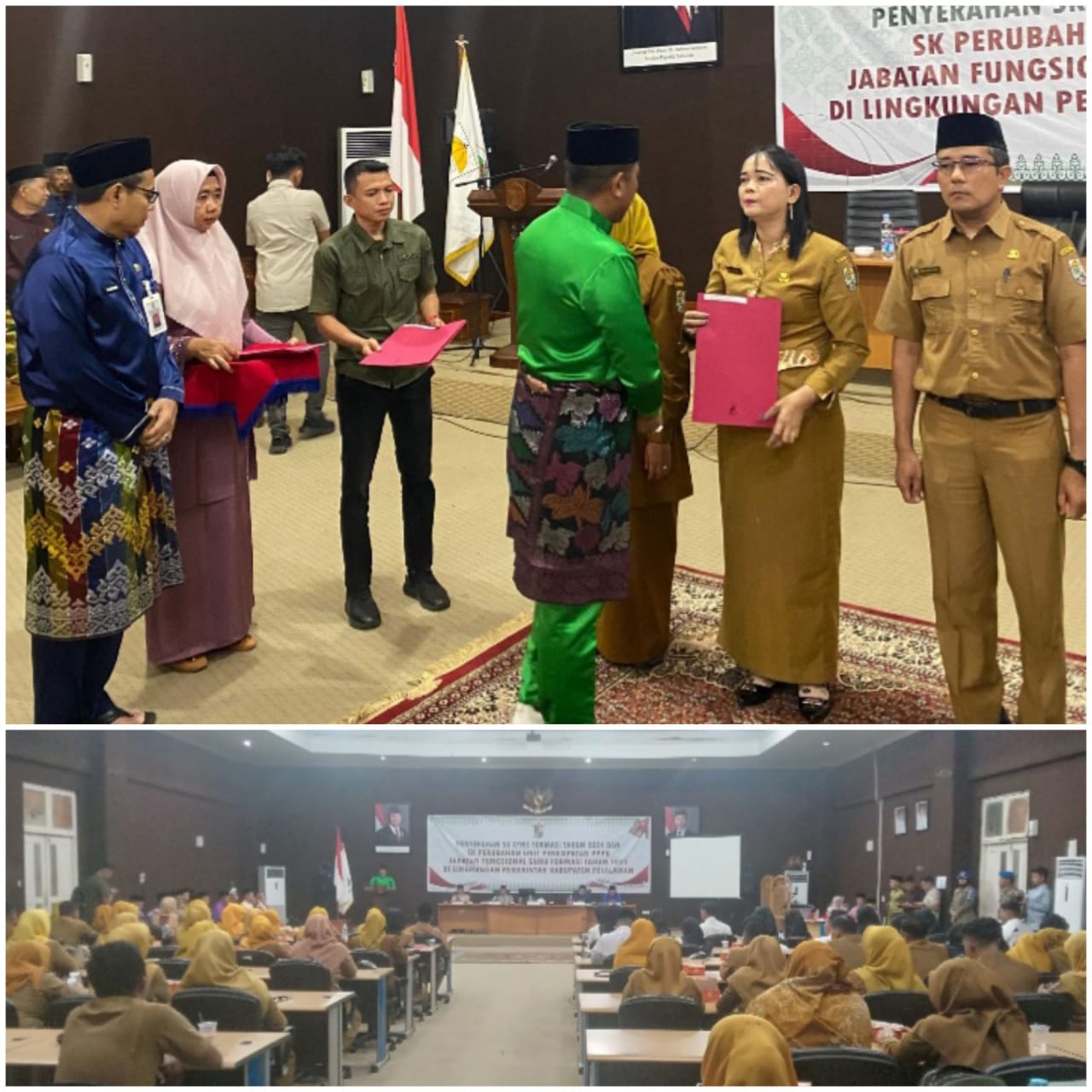 Pelalawan – Bupati Pelalawan H. Zukri SM secara resmi menyerahkan Surat Keputusan (SK) bagi 23 Calon Pegawai Negeri Sipil (CPNS) Formasi Tahun 2024 dan 84 SK Perubahan Unit Penempatan Pegawai Pemerintah dengan Perjanjian Kerja (PPPK) Jabatan Fungsional Guru Formasi Tahun 2022 di lingkungan Pemerintah Kabupaten Pelalawan. Penyerahan dilakukan di Auditorium Lantai III Kantor Bupati Pelalawan pada Jumat (4/7/2025).
