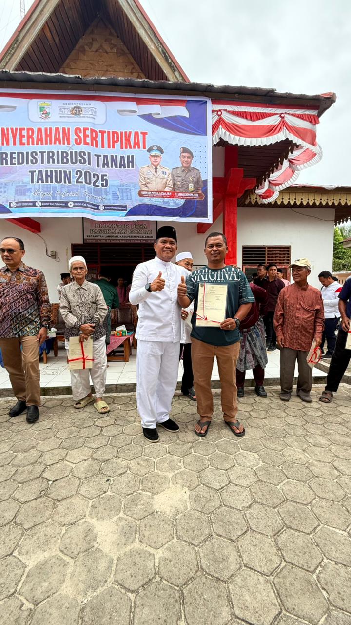 Pelalawan – pelalaBupati Pelalawan H. Zukri, SM, MM secara langsung menyerahkan sertifikat Program Redistribusi Tanah Tahun 2025 kepada masyarakat Kecamatan Langgam, khususnya Desa Pangkalan Gondai. Sebanyak 236 warga menerima sertifikat sebagai bentuk kepastian hukum atas kepemilikan tanah mereka. Kegiatan berlangsung di Kantor Desa Pangkalan Gondai, Jumat (28/11/2025).