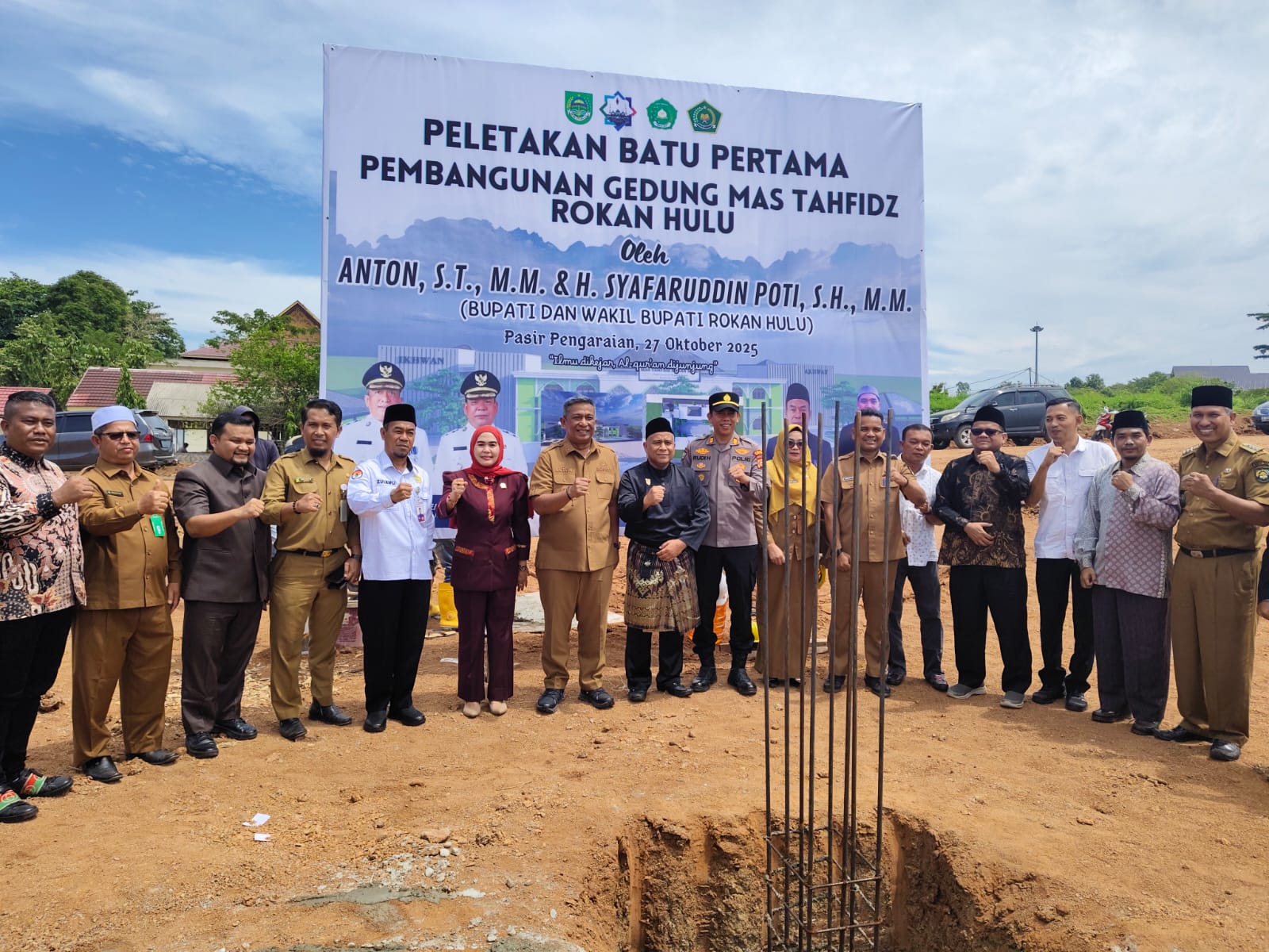 Rokan Hulu– Bupati Rokan Hulu, Anton, ST, MM, melakukan peletakan batu pertama pembangunan Gedung Madrasah Aliyah Swasta (MAS) Tahfidz Rokan Hulu, yang terletak di belakang Masjid Agung Islamic Center Pasir Pengaraian, Senin (27/10/2025). Acara ini menjadi simbol dimulainya babak baru perjalanan pendidikan Qurani di Negeri Seribu Suluk.