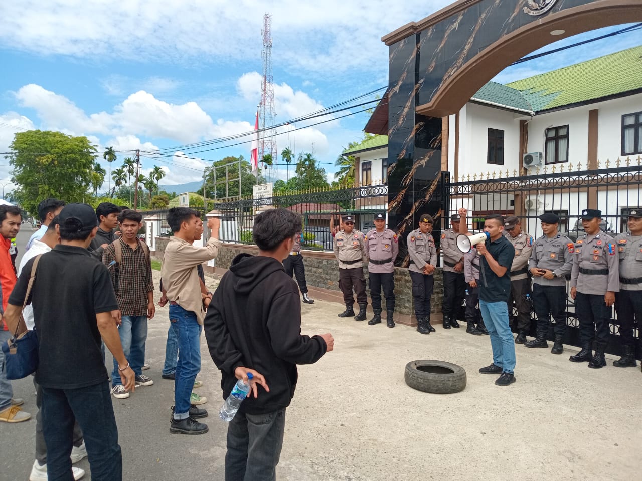 “Kami datang dengan data, bukan asumsi. Kalau memang cuti, tunjukkan suratnya! Jangan main petak umpet dengan publik,” teriak salah satu orator.