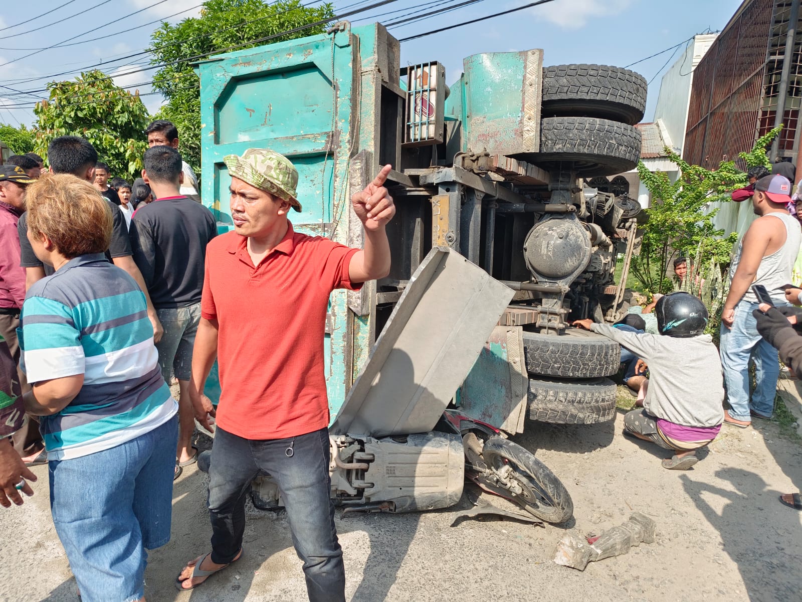 truk muatan pasir yang melaju hilang kendali atau oleng karena di tabrak mobil truk lainnya yang datang dari arah Pakam Kendaraan truk membanting stir dan terguling dan menimpa dua sepeda motor,”Ujarnya lagi.