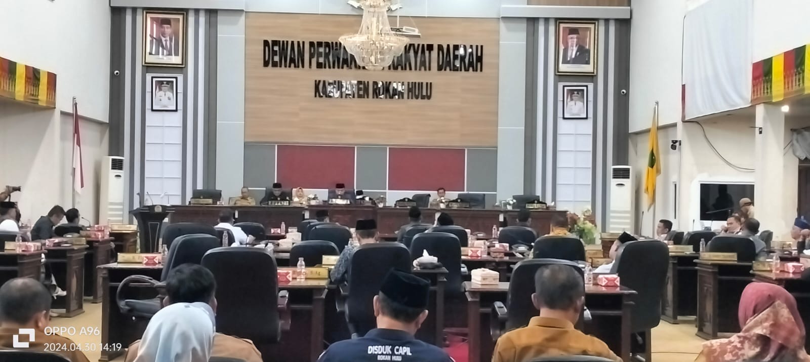 Rapat Paripurna di Ruang Rapat Paripurna Kantor DPRD Rokan Hulu dijalan Panglima Sulung, Desa Koto Tinggi, Dua Kecamatan Rambah, dipimpin Ketua DPRD Novliwanda Ade Putra, S.T. M.Si didampingi Wakil Ketua Andrizal