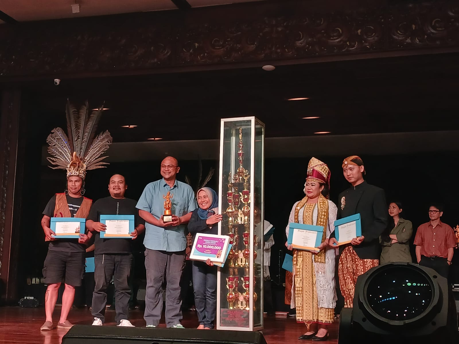 JAKARTA – Team Seni Tulang Bawang dibawah binaan Ibu Herlinawati Qudrotul SH berhasil menghantarkan Provinsi Lampung masuk lima besar terbaik dalam event Parade Lagu Daerah ke-37 Tahun 2023 Se-Indonesia, yang dilaksanakan di Taman Mini Indonesia Indah (TMII), Jakarta, Minggu (10/12/2023).
