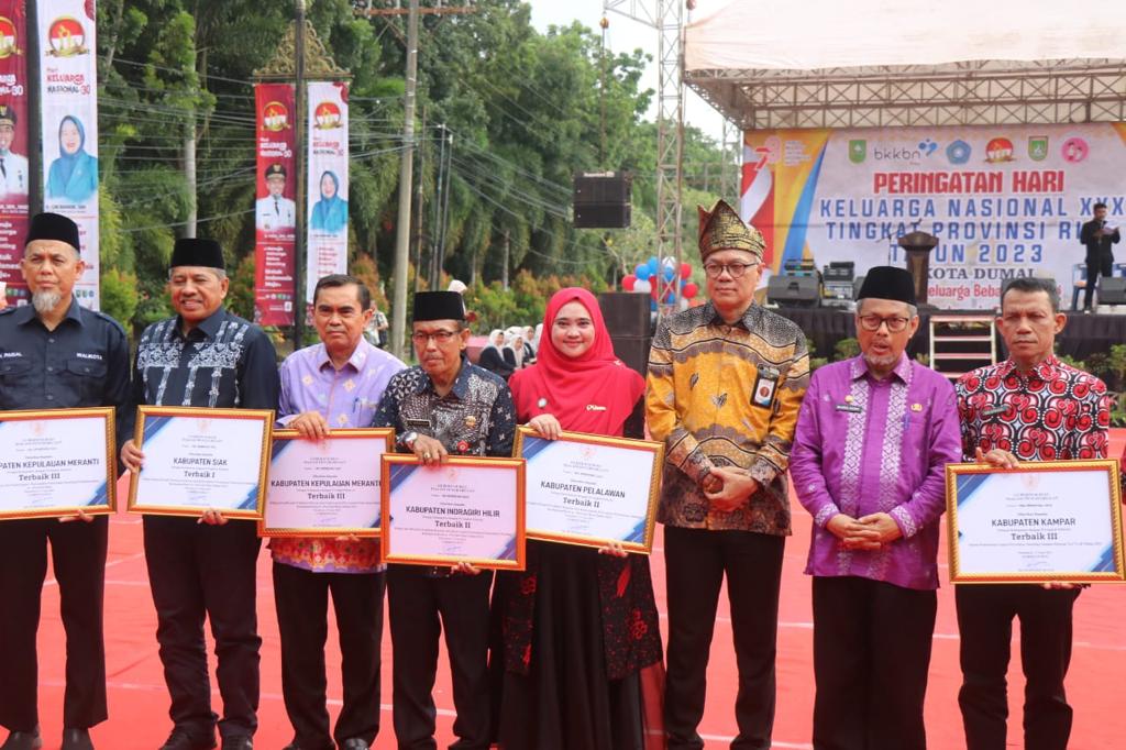 Pada peringatan Hari Keluarga Nasional (Harganas) Ke – 30 Tingkat Provinsi Riau Tahun 2023 ini, Kabupaten Pelalawan banyak meraih penghargaan. Sejumlah penghargaan yang diraih oleh Kabupaten Pelalawan diantaranya adalah pertama piagam penghargaan dari Gubernur Riau kepada Kabupaten Pelalawan sebagai Kabupaten dengan peringkat Kinerja Terbaik II Paling Inspiratif pada Penilaian Kinerja Aksi Konvergensi Percepatan Penurunan Stunting Kabupaten/Kota se-Provinsi Riau Tahun 2022 yang diserahkan langsung oleh Gubernur Riau yang diwakilkan oleh Asisten I Setda Provinsi Riau Drs. H. Masrul Kasmy kepada Sekretariat TPPS Kabupaten Pelalawan sekaligus Kepala DP3AP2KB Kabupaten Pelalawan Prima Merdekawati, S.Kep., M.K.M.dan disaksikan oleh Sekretaris Utama BKKBN RI Drs. Tavip Agus Rayanto, M.Si.