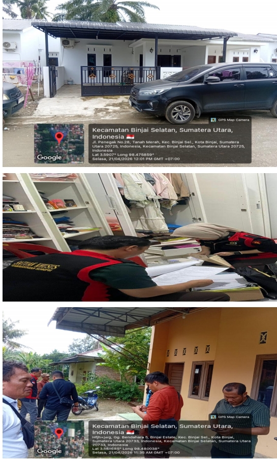 Kejaksaan Negeri Binjai melalui Tim Penyidik Tindak Pidana Korupsi yang di dampingi oleh Tim Intelijen serta pihak Kepolisan dan disaksikan oleh Perwakilan Camat / Lurah / Kepling setempat melakukan penggeledahan pada 2 (dua) rumah Pribadi Tersangka AGUNG RAMADHAN Als AR yang berada di Jalan Penegak Kelurahan Tanah Merah Kecamatan Binjai Selatan dan Jalan Gunung Bendahara Gang Bendahara No.05 Lingkungan XII Kelurahan Binjai Estate Kecamatan Binjai Selatan,(Selasa,21/04/26).