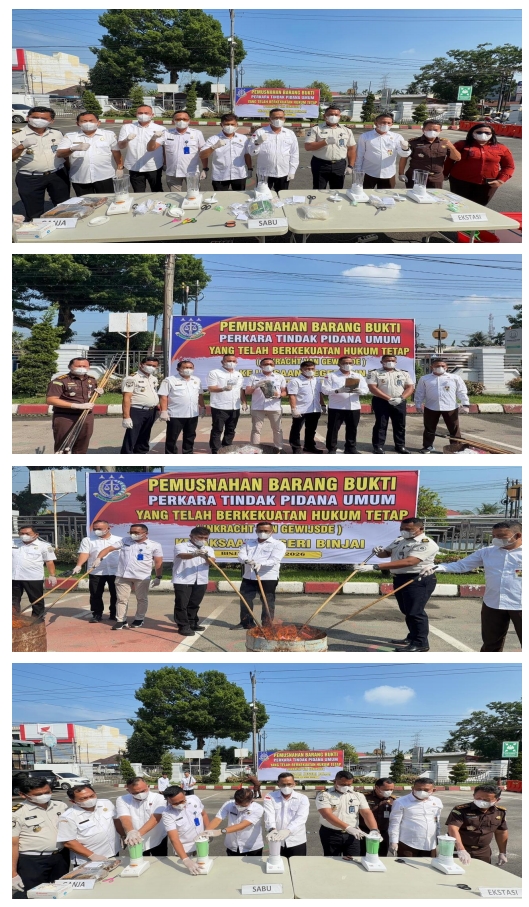 Adapun barang bukti yang dimusnakan Periode Desember 2025 s/d Maret 2026 sebanyak 41 (Empat Puluh Satu) perkara, yang terdiri dari Berkas Perkara Narkotika sebanyak 30 (tiga puluh) perkara, dengan rincian Barang bukti Sabu seberat 2.069,34 (Dua Ribu Enam Puluh Sembilan Koma Tiga Empat) gram, Barang bukti Ekstasi sebanyak sebanyak 489 (empat ratus delapan puluh semblan) butir. Barang Bukti Ganja seberat 1.840,18 (seribu delapan ratus empat puluh koma satu delapan ) gram serta OHARDA terdiri dari 10 (sepuluh) perkara berupa baju dan Tindak Pidana Umum Lainnya (TPUL) atau Keamanan Negara dan Ketertibaan Umum (KAMNEGTIBUM) terdiri dari 1 (satu) Perkara berupa senjata tajam, dimana pemusnahan narkotika dilakukan dengan cara melarutkan dengan blender dan air panas sedangkan barang bukti lainnya dilakukan pemusnahannya dengan cara dihancurkan dibakar ataupun dengan menggunakan alat pemotong, yang disaksikan dan dihadiri perwakilan Wali Kota Binjai Drs. Ruslianto selaku Kepala KesbagPol, Rudi Sembiring Perwakilan Kalapas Kelas IIA Binjai, Mewakili Kapolres Binjai AKP. Ismail Pane, SH., M.H., (Kasat Narkoba), Kepala BNN Binjai Ucok Ferry, SH., MH., Kepala Dinas Kesehatan Kota Binjai Dr. Sugianto, Sp.OG., M.K.M., serta seluruh Pegawai dilingkungan Kejaksaan Negeri Binjai yang mana kegiatan diakhir acara dilakukan penandatangan berita acara pemusnahan barang bukti oleh seluruh saksi dan tamu undangan hingga selesai situasi dan kondisi berjalan lancar aman dan terkendali. Ungkap Kepala Seksi Intelijen