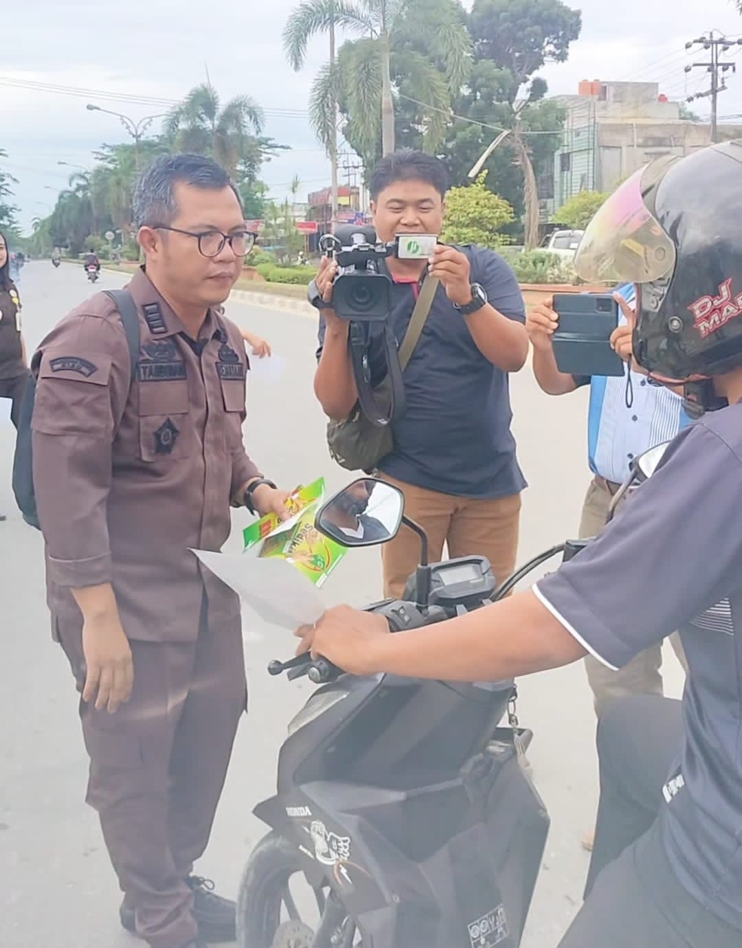 Pangkalan Kerinci – Kejaksaan Negeri Kabupaten Pelalawan membagikan brosur berisi himbauan anti korupsi bagi penggunan jalan di Jalan Lintas Timur Pangkalan Kerinci Tepatnya depan SPBU Kota, kabupaten Pelalawan, Provinsi Riau, Kamis (4/7/2024).