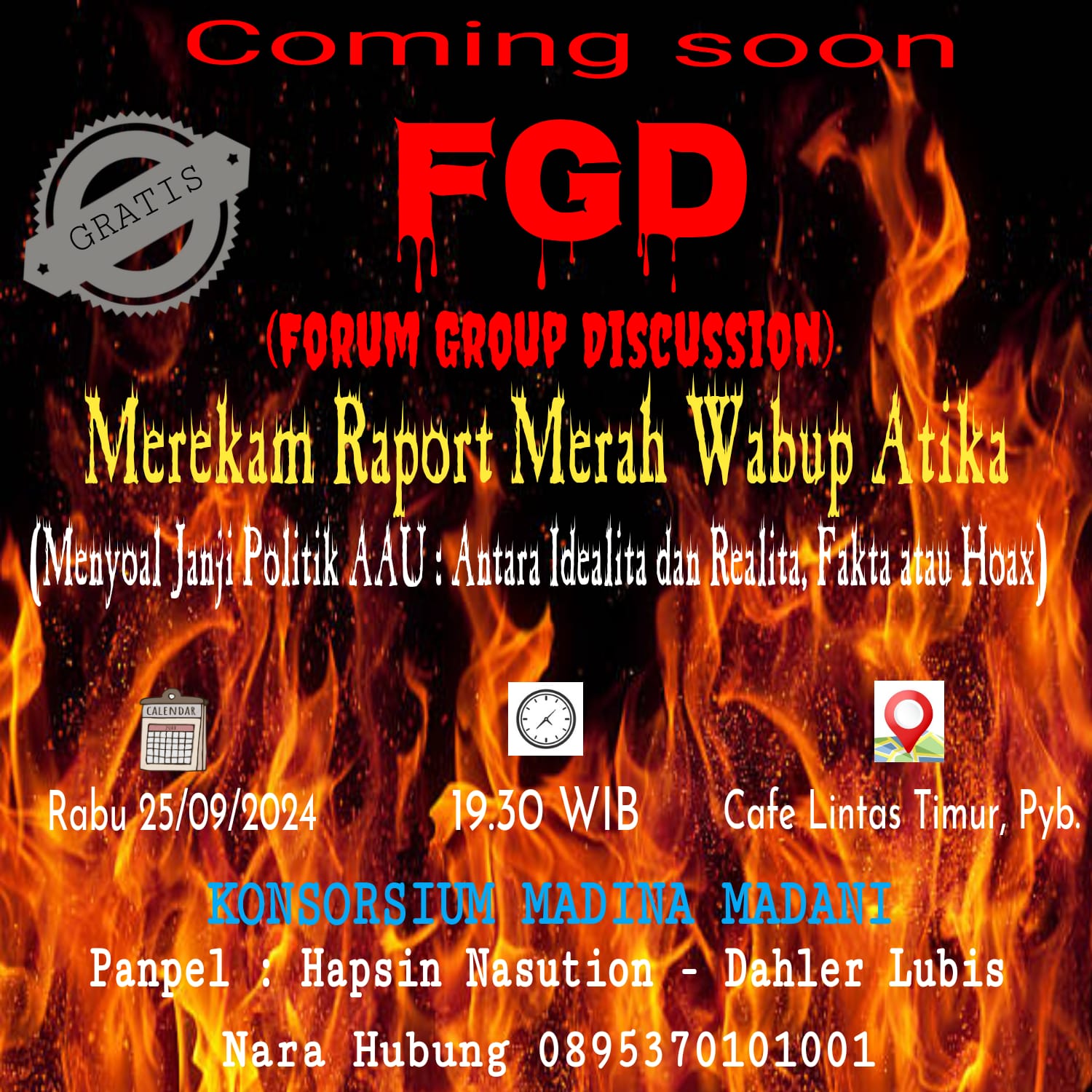FGD bertajuk Merekam Raport Merah Wabup Atika (menyoal janji politik Atika: Antara Idealita dan Realita, Fakta atau Hoax rencananaya akan digelar besok malam (25/09) bertujuan memberikan pembelajaran demokrasi yang sehat (political education), penegasan tanggungjawab moral masyarakat dalam mengawal agenda pembangunan serta memberikan “shock theraphy” kepada para pejabat agar tidak mudah ingkar janji.