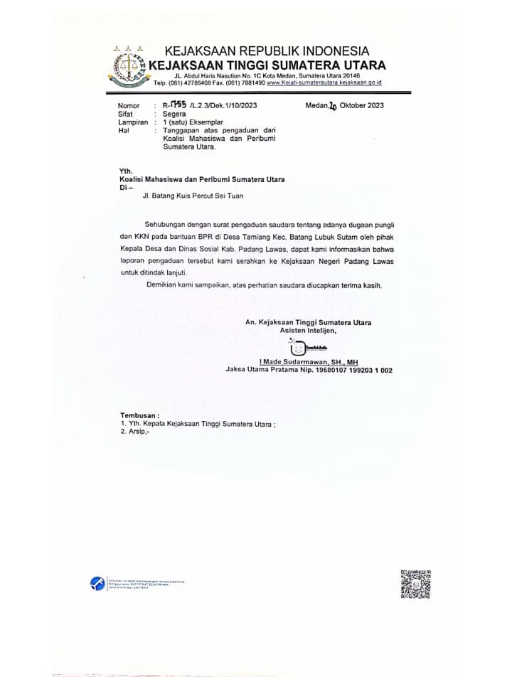 Namun pada tanggal 20 Oktober Tahun 2023 dengan nomor surat : R-1753/L.2.3/Dek.1/10/2023 pihak Kejati Sumut mengeluarkan surat pemberitahuaan terkait penyerahan/pengalihan laporan pengaduaan dugaan pungli dan KKN pada bantuan BPR (Bantuan Perbaikan Rumah) di Desa Tamiang Kecamatan Batang Lubuk Sutam Kab. Palas tersebut kepada pihak Kejaksaan Negeri Padang Lawas untuk ditindak lanjuti kembali.