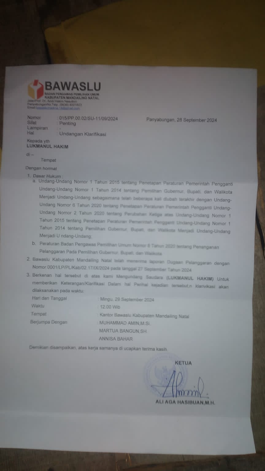 Ditempat terpisah Lukman (terlapor) ketika dikonfirmasi media, membenarkan hal tersebut bahwa mereka telah memberikan klarifikasi kepada Bawaslu Madina pada hari ini, 29/09.