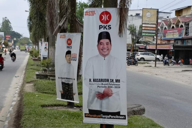 Banner Bakal Calon Wakil Gubernur Riau dan Balon Bupati Pelalawan terpasang pada pohon-pohon di jantung kota Jalan Lintas Timur tertancap mulai dari depan Ramayana sampai gerai makan Pangkalan Kerinci.
