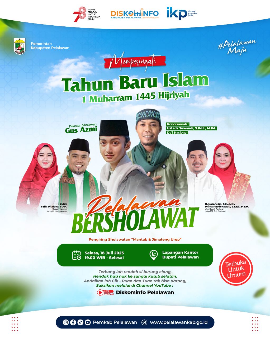 Pelalawan suaramassa co.id – Pemerintah Kabupaten Pelalawan akan menggelar kegiatan Pelalawan Bersholawat bersama pelantun sholawat Gus Azmi dan Da’i nasional Ustadz Suwandi pada Selasa (18/7/2023) malam di halaman Kantor Bupati Pelalawan.