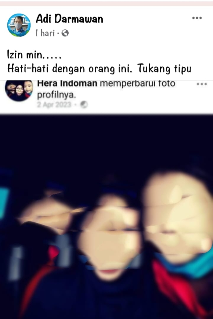Selanjutnya pada postingan yang berisi tulisan izin min…. Hati-hati dengan orang ini. Tukang tipu, ia menyertakan foto seorang wanita bersama dengan foto kedua anak dibawah umur, sehingga beberapa netizen yang berkomentar kenapa foto anak-anak dalam postingan itu tidak di blur.