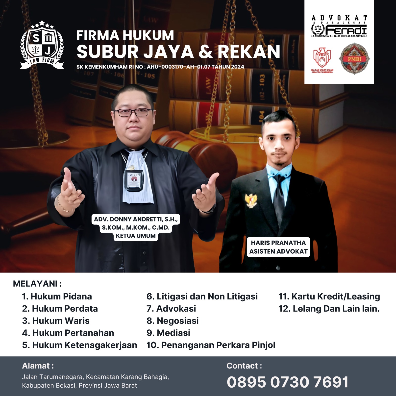Bekasi – Firma Hukum Subur Jaya dan Rekan kini resmi beroperasi berdasarkan Surat Keputusan (SK) Kementerian Hukum dan Hak Asasi Manusia (Kemenkumham) RI Nomor: AHU-0003170-AH-01.07 Tahun 2024. Firma ini dipimpin oleh Donny Andretty, S.H., S.Kom., M.Kom., C.MD sebagai Ketua Umum, dengan Alpiner Marhusor Siahaan, S.H., CMNI menjabat sebagai Ketua Dewan Pimpinan Cabang (DPC) Kabupaten Bekasi. Sementara itu, Meryanto, S.H. bertindak sebagai Pembina, dan Haris Pranatha sebagai Asisten Advokat di Feradi Warung Paralegal Indonesia (WPI).
