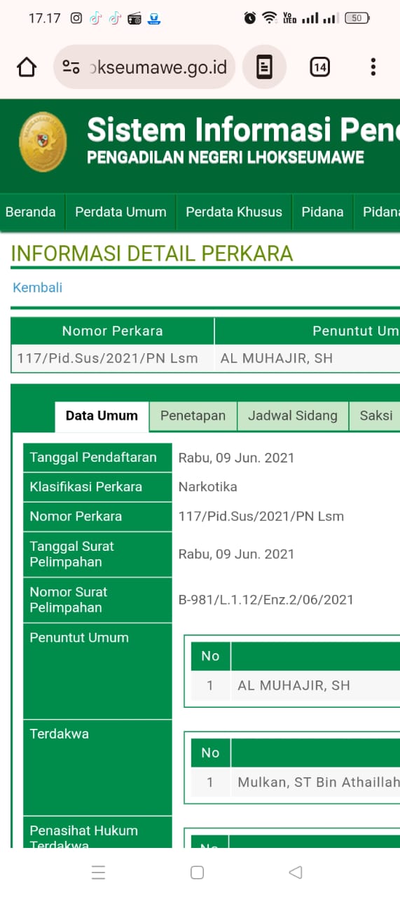 Data persidangan yang didapat redaksi menunjukkan, Mulkan pernah duduk di kursi pesakitan Pengadilan Negeri Lhokseumawe dalam perkara Nomor 117/Pid.Sus/2021/PN Lsm.