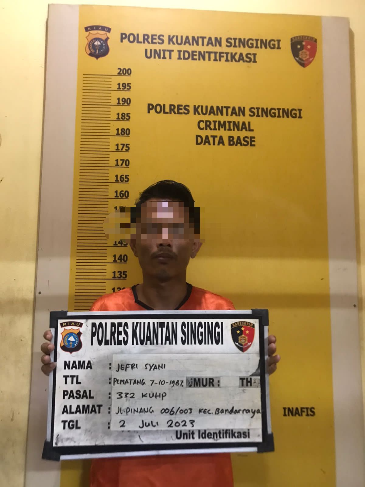 Kemudian Tim Opsnal Polres Kuansing pun berhasil mengamankan di duga pelaku JS (36) di dalam rumah korban tersebut, kemudian pelaku ditangkap beserta barang bukti dan dibawa ke Mapolres Kuansing Guna proses hukum lebih lanjut.