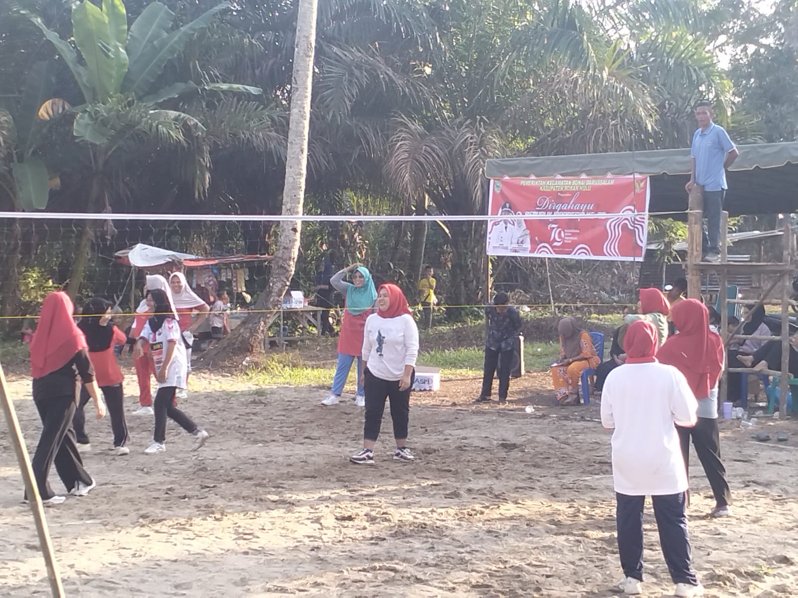 BERTANDING : Sambut HUT RI ke 79 Ibu Ibu Desa Tanjung Belit sedang ikut lomba volly ball