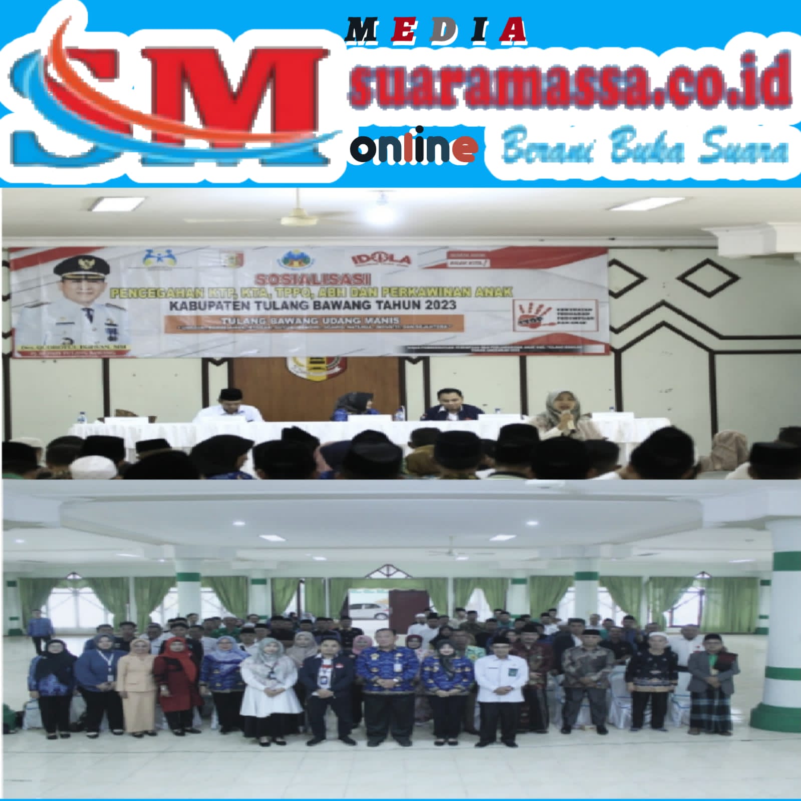 [] Suaramassa.co.id []Tulang Bawang Lampung – Pemerintah Kabupaten Tulang Bawang Melalui Dinas Pemberdayaan Perempuan dan Perlindungan Anak (PP&PA) kabupaten setempat menggelar sosialisasi pencegahan Kekerasan Terhadap Perempuan (KTP) Kekerasan Terhadap Anak (KTA) ABH dan Perkawinan Anak Kabupaten Tulang bawang Tahun 2023 di aula masjid Agung Biturachman Islamic center Menggala Tulang Bawang, Senin ( 17/7).