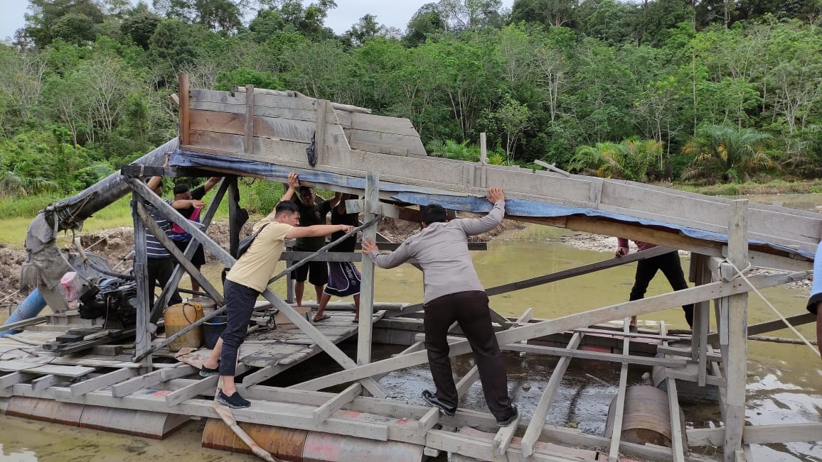 Saat dilakukan penertiban di Lokasi Pertama ( I ) , petugas gabungan berhasil menjumpai tiga (3) buah Rakit PETI yg di duga baru berhenti bekerja dan ditinggal oleh pemilik / pekerjanya , selanjutnya ” petugas gabungan melakukan tindakan pengerusakan terhadap ke tiga (3) Rakit tersebut dengan cara membongkar dan menghancurkan rakit tersebut serta memecah pipa paralon dan mesin-mesin dompeng yg digunakan untuk melakukan aktivitas PETI oleh pelaku agar tidak dapat digunakan lagi ” tegas IPDA Mario Suwito. SH dalam keterangannya.