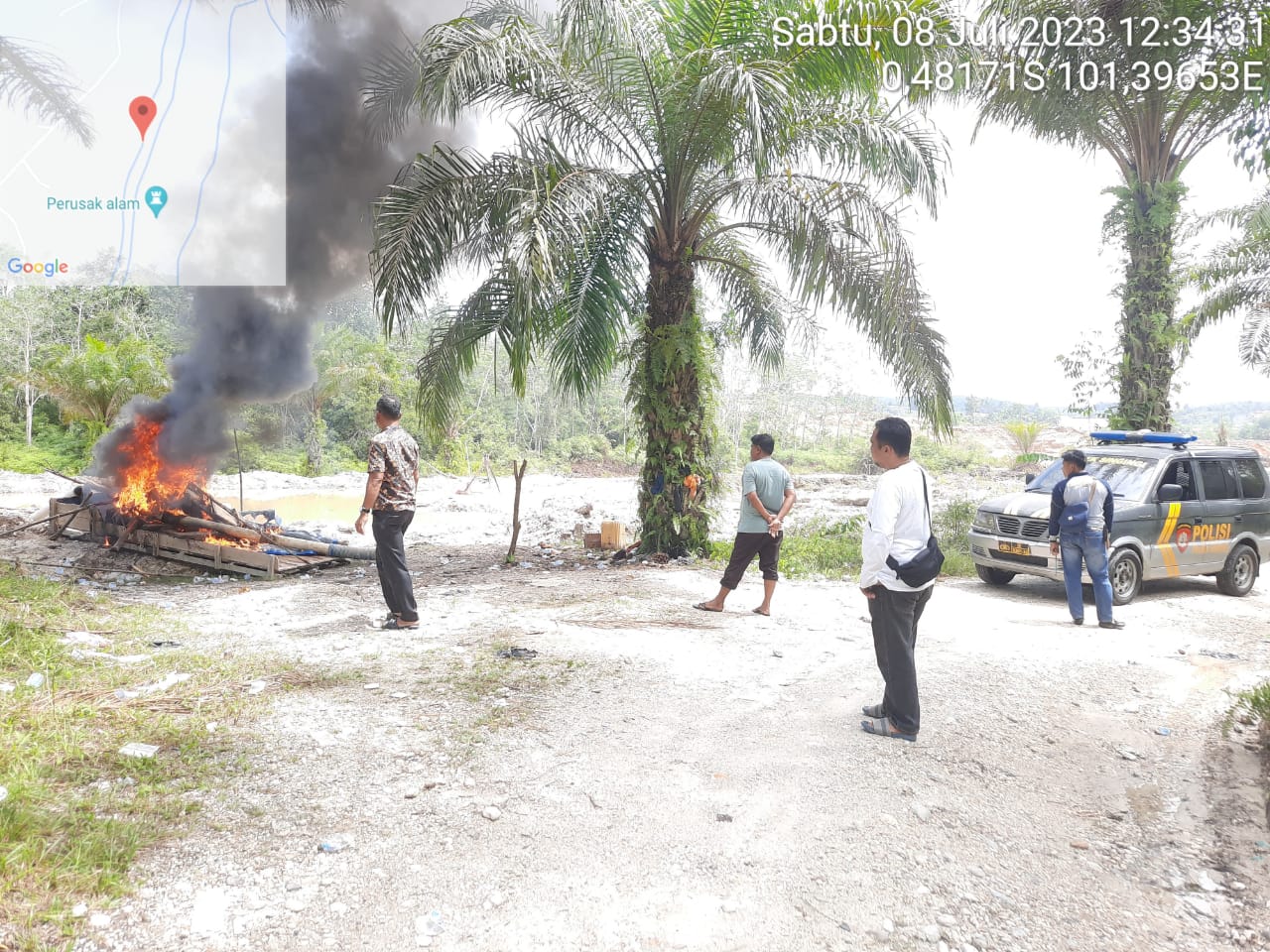 KUANTAN SINGINGI (SM) – Penindakan satu unit rakit penambangan emas tanpa izin (PETI) yang tidak beroperasi di Desa Logas, Kecamatan Singingi, Kabupaten Kuantan Singingi dirusak dan dibakar oleh Personil Polsek Singingi, Sabtu (08/07/2023) sekira pukul 11.30 WIB.