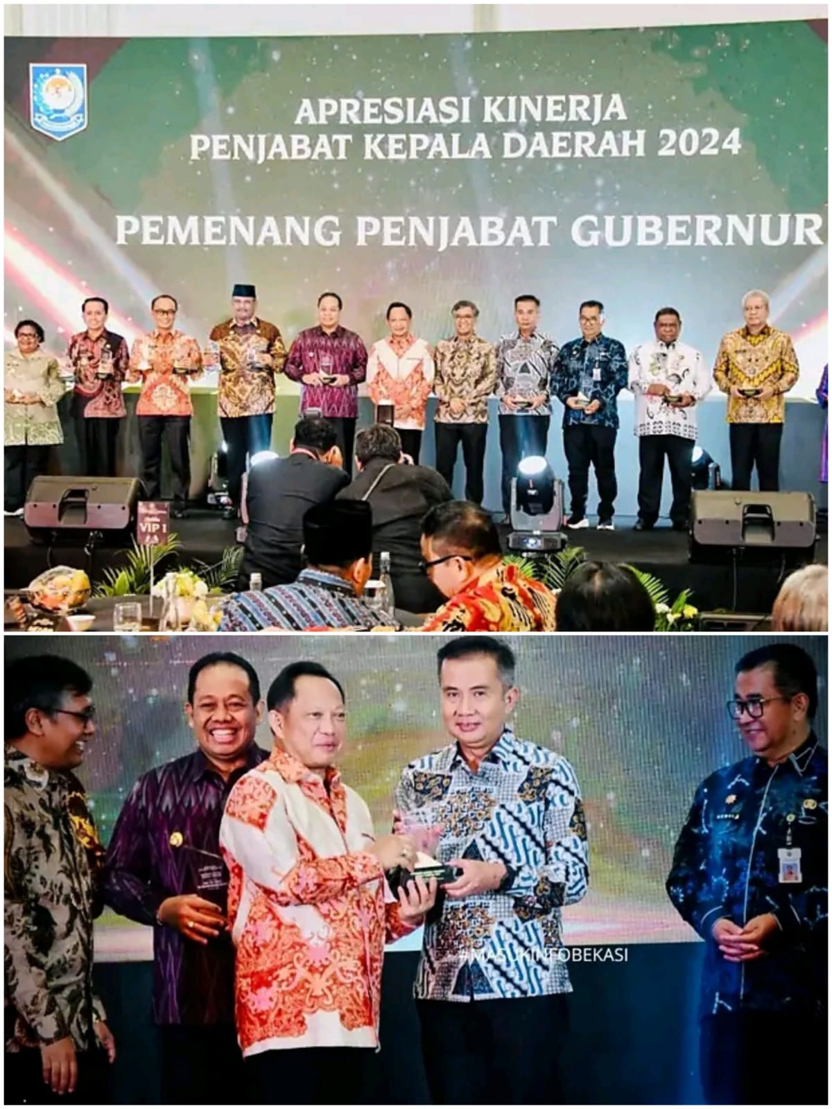 Plakat penghargaan diserahkan langsung oleh Menteri Dalam Negeri RI, Tito Karnavian, kepada Bey Machmudin dalam acara yang digelar di The Tribata Hotel & Convention Center Darmawangsa, Jakarta, pada Jumat (30/8/2024).