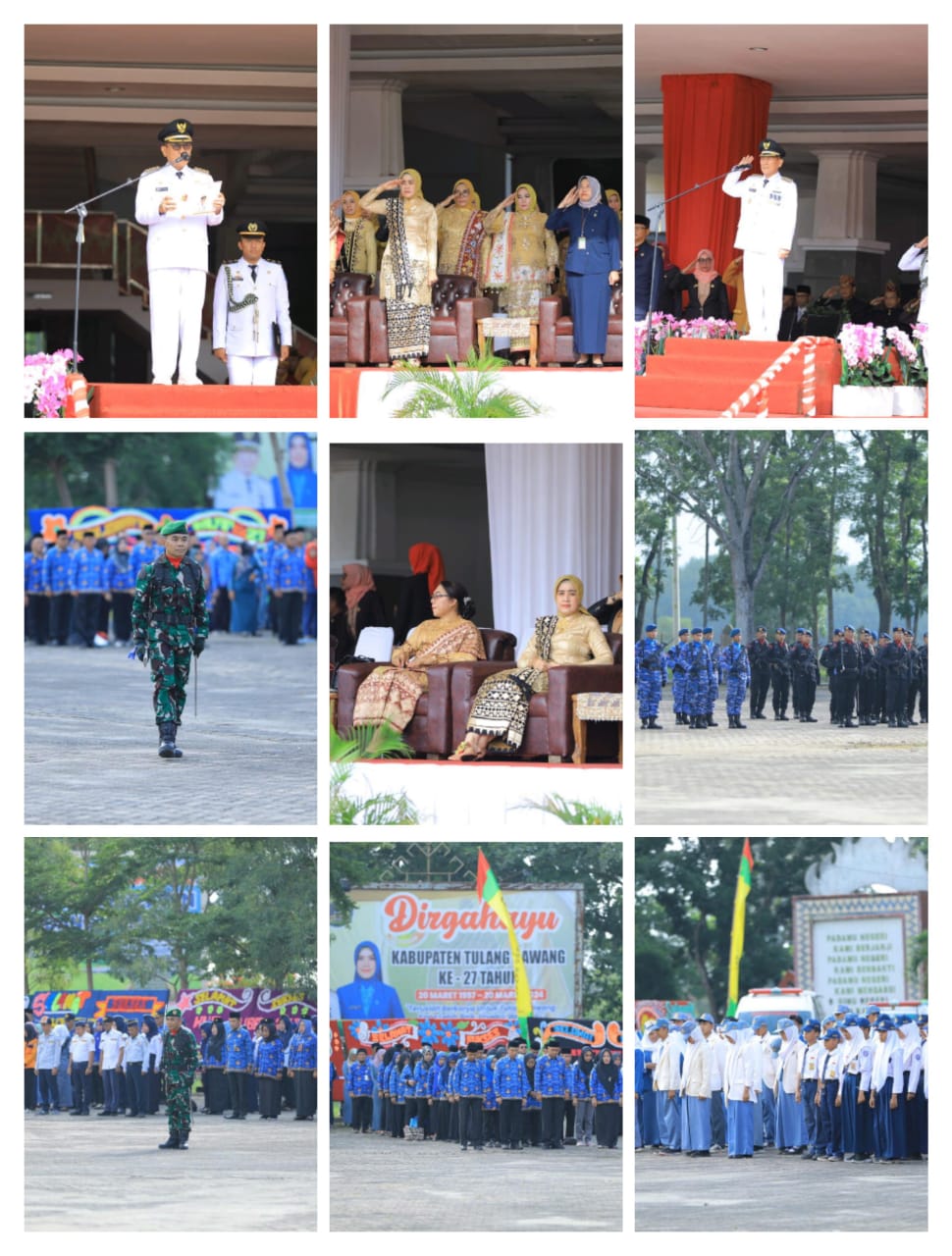 TULANG BAWANG Pj Bupati Drs. Qudrotul Ikhwan, MM memimpin langsung upacara peringatan Hari Ulang Tahun (HUT) Kabupaten Tulangbawang yang ke-27. Kegiatan tersebut digelar di halaman kantor Bupati setempat, Rabu (20/3/2024).