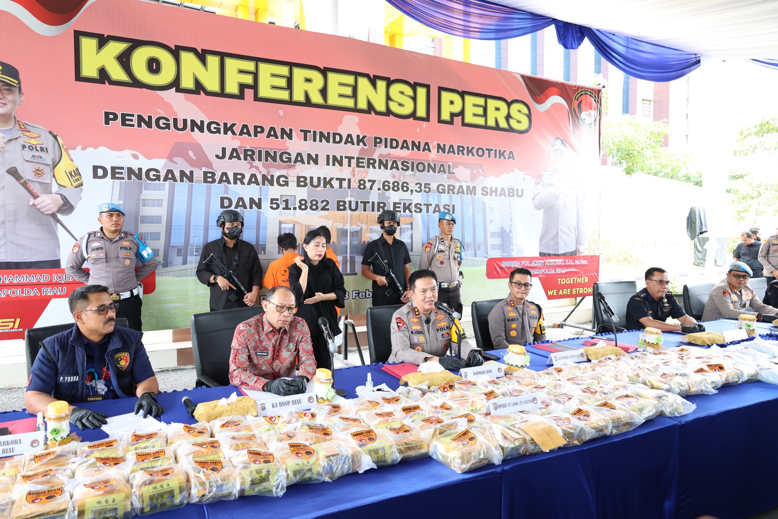 Polda Riau berhasil mengungkap jaringan narkotika internasional dengan barang bukti bukti 87,686 kg sabu dan 51.882 butir pil ekstasi.