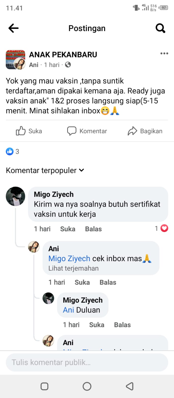 Di Kota Pekanbaru, Riau, ada oknum pengguna media sosial menawarkan jasa pembuatan Sertifikat Vaksin 1 dan 2, tanpa mengharuskan pemesan vaksin ikut disuntik. Begini bunyi penawaran dari media sosial tersebut, ‘Yok yang mau vaksin ,tanpa suntik terdaftar,aman dipakai kemana aja. Ready juga vaksin anak” 1&2 proses langsung siap(5-15 menit. Minat sihlakan inboxπŸ˜πŸ™.’ Pesan via media sosial Facebook itu berasal dari pemilik akun bernama Ani, yang dishare di akun grup Facebook bernama Anak Pekanbaru.