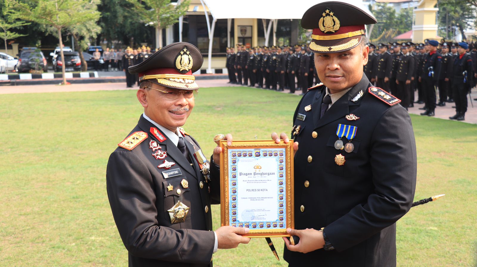 50 Kota ||- Kapolda Sumatera Barat Irjenpol Suharyono, S.I.K., S.H., berikan langsung penghargaan Inovasi Problem Solving kepada Kapolres 50 Kota AKBP Ricardo Condrat Yusuf, S.H., S.I.K., M.H.