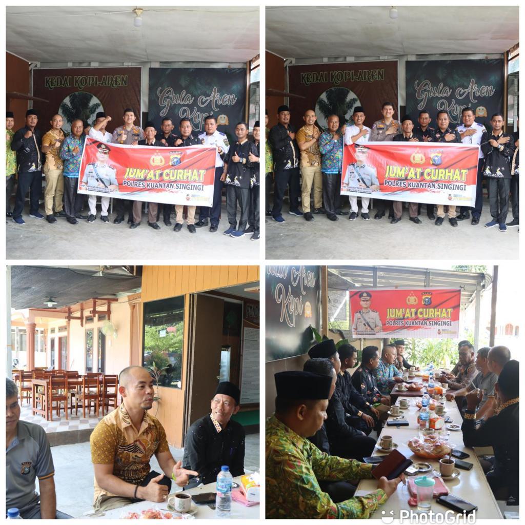 TELUK KUANTAN (SM) – Polres Kuantan Singingi (Kuansing) melaksanakan kegiatan Jumat Curhat yang memungkinkan masyarakat menyampaikan secara langsung terkait keluhannya kepada polisi dan diterima langsung oleh Kapolres Kuansing yang di wakili oleh Kasat Binmas Polres Kuansing Akp Subagja,Kasat Lantas AKP Sandy Humisar Sibarani dan Iptu Novris Simanjuntak SH MH Jum’at (12/5/2023) Sekira pukul 09.00 Wib dikedai Kedai Kopi Aren jalan Rustam M Abrus Kacamatan Kuantan Tengah Kabupaten Kuantan Singingi.
