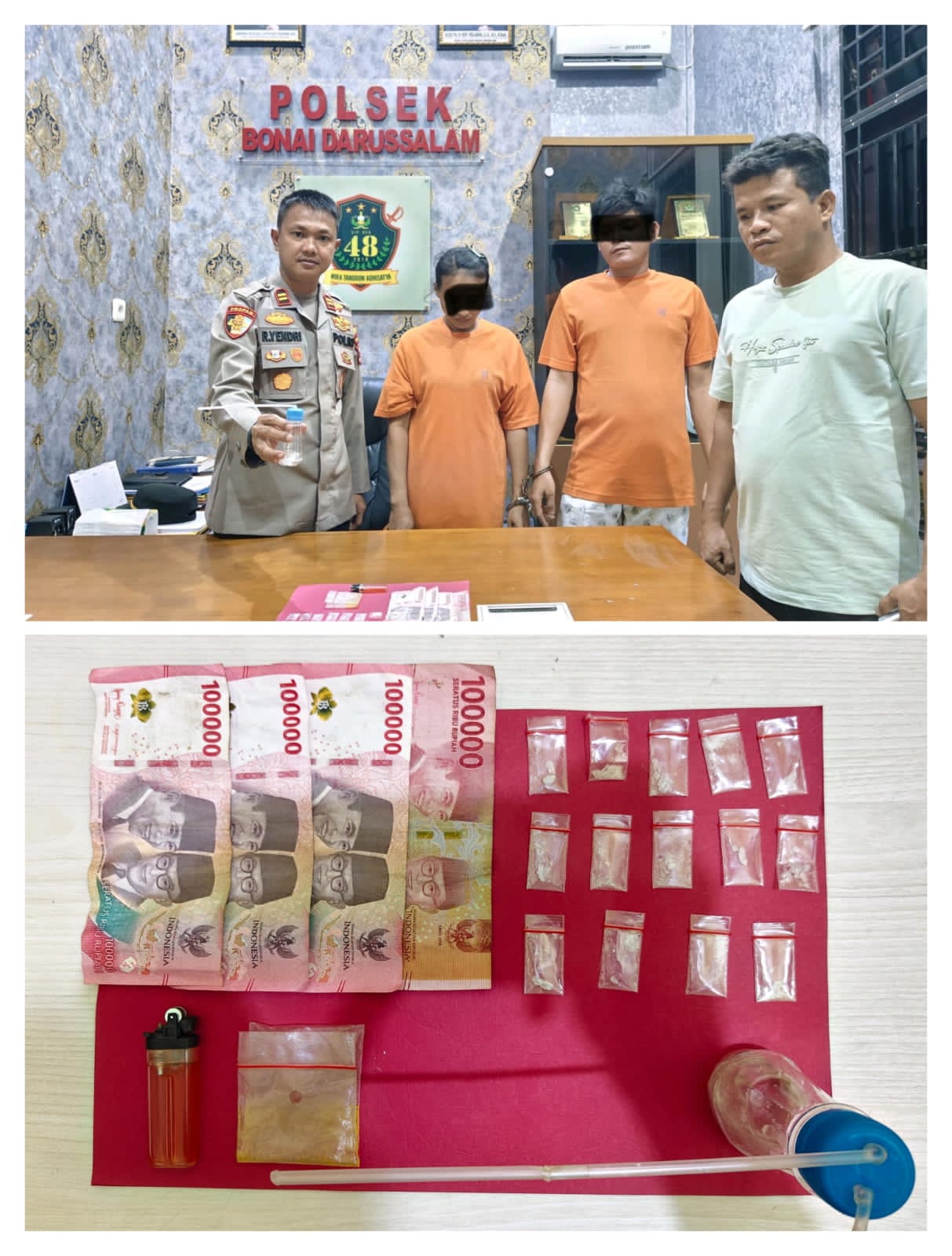 Rokan Hulu — Kepolisian Sektor (Polsek) Bonai Darussalam berhasil mengungkap kasus penyalahgunaan narkotika jenis sabu pada Kamis malam (17/04/2205). Dua pelaku, seorang pria dan seorang wanita, diamankan di sebuah rumah di Dusun Air Hitam, Desa Teluk Sono, Kecamatan Bonai Darussalam, Kabupaten Rokan Hulu.