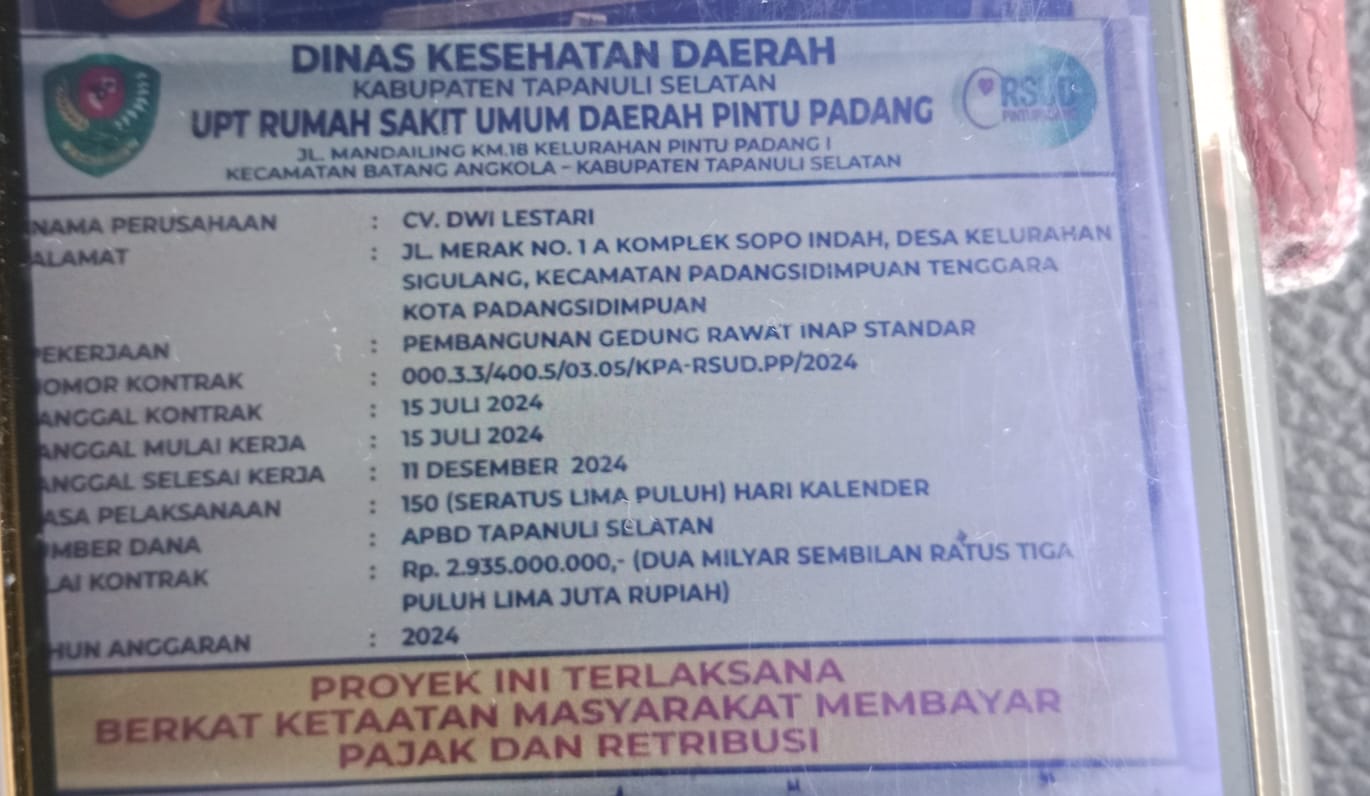 Sementara itu, ketika dikonfirmasi melalui pesan WhatsApp oleh awak media, PPK proyek Dinas Kesehatan Kabupaten Tapsel, Suriadi, tidak memberikan jawaban hingga berita ini diterbitkan.