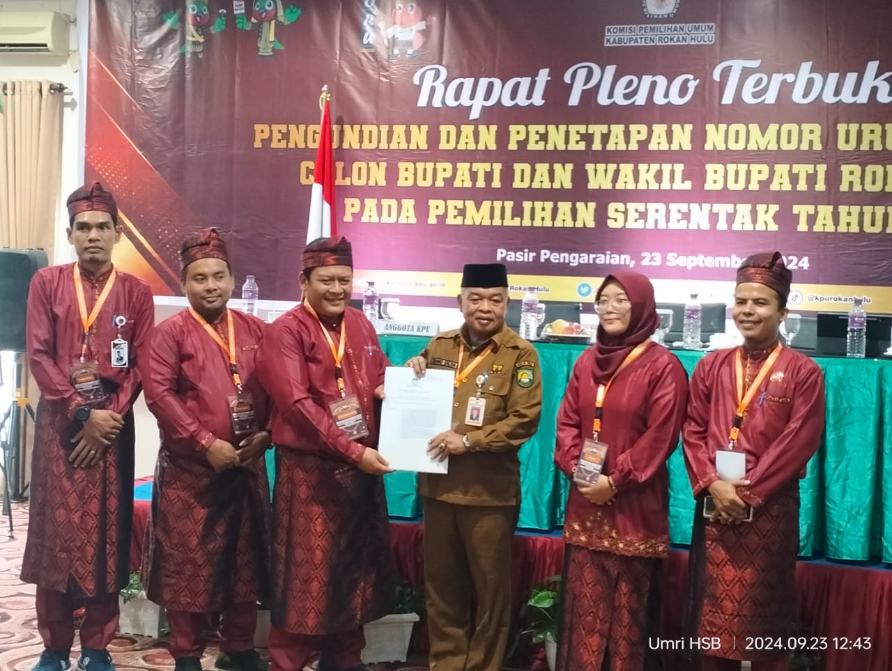 Rokan Hulu (suaramassa.co.id ) – Komisi Pemilihan Umum (KPU) Kabupaten Rokan Hulu, Provinsi Riau, melaksanakan rapat pleno pengundian dan pengumuman nomor urut pasangan calon bupati dan calon wakil bupati pada hari Senin, 23/09/2024, di Hotel Sapadia. Acara ini bertujuan untuk menentukan nomor urut yang akan digunakan dalam Pemilihan Kepala Daerah (Pilkada) mendatang.