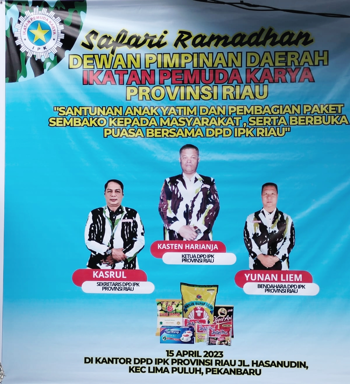 Pekanbaru suaramassa.co.id, – Dewan Pimpinan Daerah Ikatan Pemuda Karya Provinsi Riau ( DPD IPK ) melaksanakan santunan anak yatim dan pembagian paket sembako kepada masyarakat, serta berbuka puasa bersama dengan seluruh pengurus dan anggota IPK Se provinsi Riau di Kantor DPD I IPK Riau, jalan Hasanudin, kelurahan Rintis, kecamatan lima puluh kota Pekanbaru, Minggu 15 April 2023.