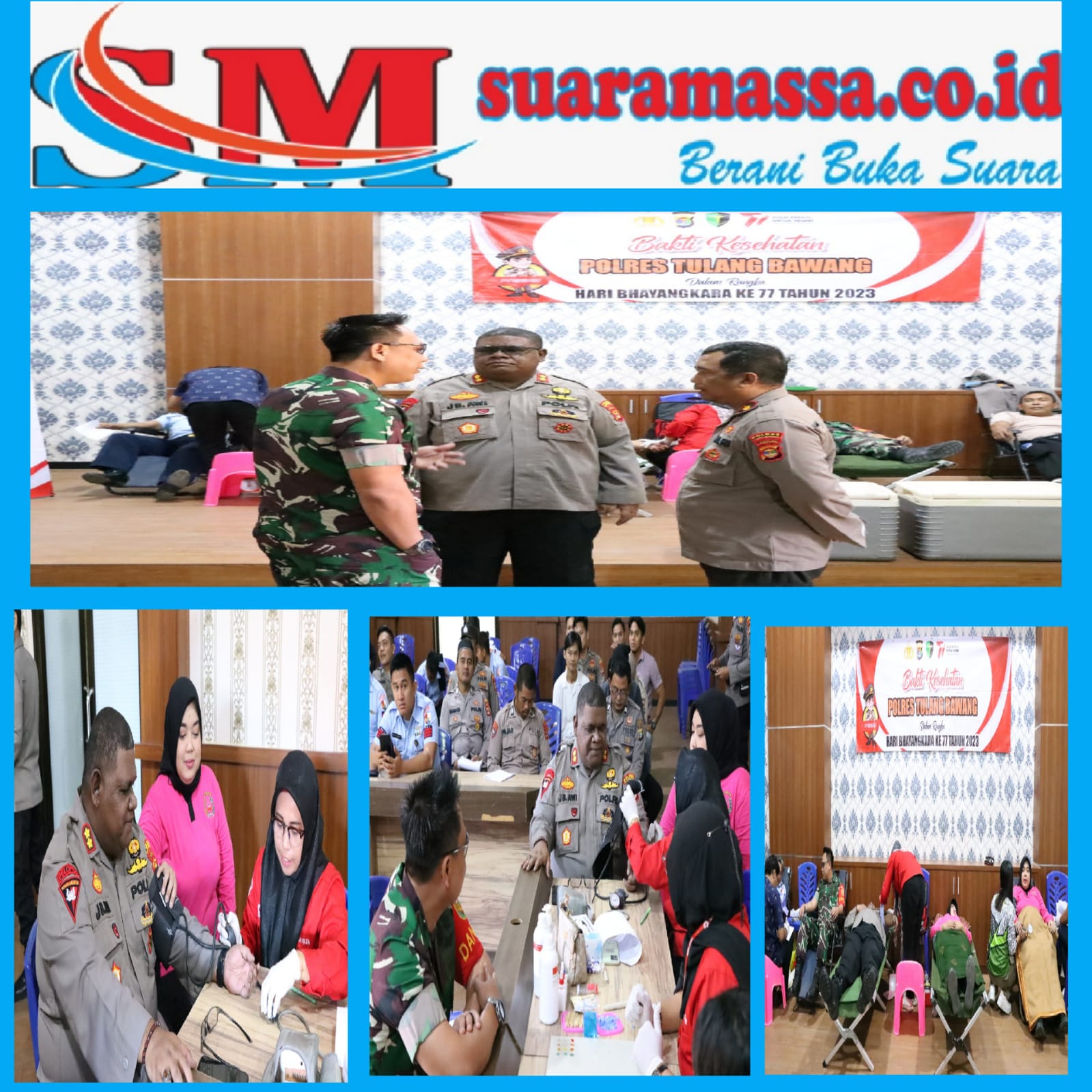 []Suaramassa.co.id.[]Tulang bawang Lampung – Menyambut Hari Bhayangkara ke-77 Tahun 2023, Polres Tulang Bawang, Polda Lampung, bersama Tentara Nasional Indonesia (TNI) menyelenggarakan bakti kesehatan berupa donor darah dan vaksinasi Covid-19 secara gratis.