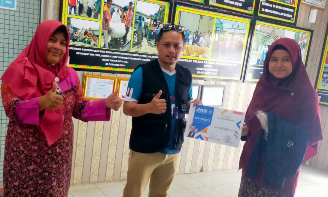 Bertempat di aula SMKN 1 Pangkalan Kerinci, Ketua JMSI Erik Suhenra, S. I. Kom menyerahkan sertifikat kepada Rahmi Fadillah perwakilan siswa yang mengikuti pelatihan Jurnalistik beberapa waktu lalu.