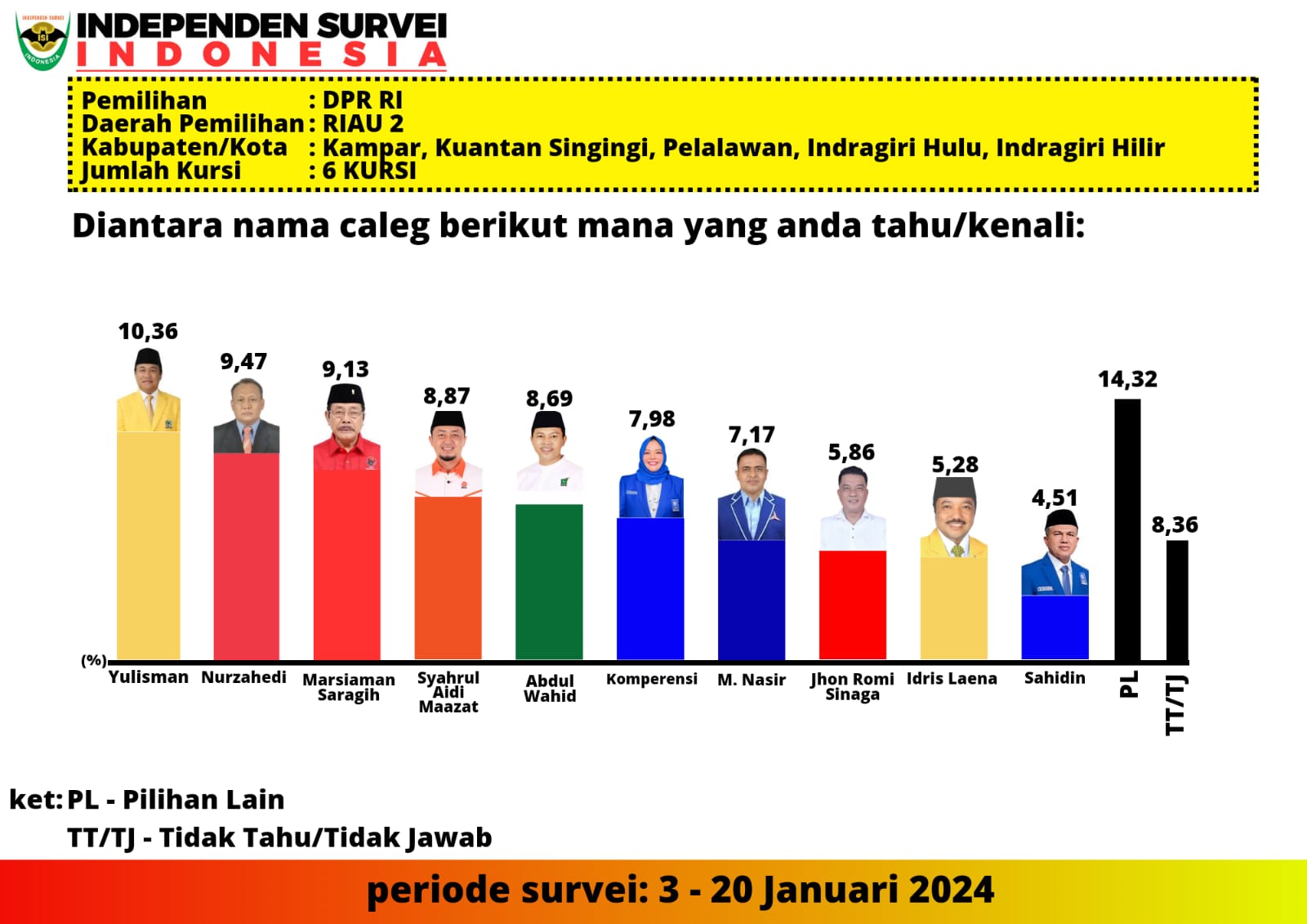 Adapun rincian hasil Survei ISI terhadap Caleg DPR RI Potensial Terpilih pada Pemilu 2024 mendatang, dengan pertanyaan Diantara nama Caleg berikut, siapa yang anda pilih jika Pileg 2024 dilaksanakan hari ini ? yakni Yulisman dan Nurzahedi yang bertengger di posisi 1 dan 2. Elektabilitas masing-masing 14,87% Yulisman dan 12,03% Nurzahedi.