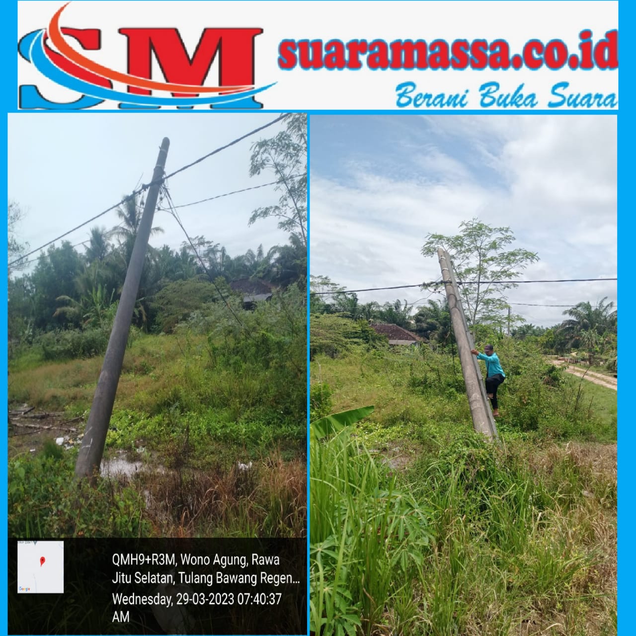 Salah satu warga yang berada dipingir sungai kampung wono agung menjelaskan ketim media,Tiang listrik yang hampir roboh pak,udah lama pak, hampir lima bulan Belum ada perbaikan dari pihak PT persero PLN kabupaten tulang bawang pak.