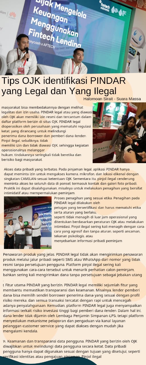 “Dengan keberadaan jurnalis, literasi mengenai pindar legal dan illegal dapat dipahami sehingga masyarakat dapat mengantisipasi telpon masuk yang mencurigakan, layanan yang meminta OTP tanpa persetujuan pengguna, hingga deteksi malware.Terlebih Pindar Ilegal mensalahgunakan data untuk kepentingan yang tidak bertanggungjawab dari oknum oknum yang mengatasnamakan OJK” Ujar Tubagus saat diwawancarai Suara Massa.