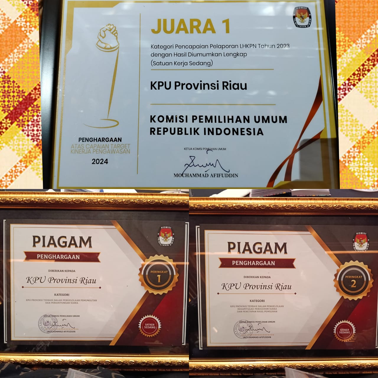 Pada tanggal 12 Desember 2024, di Hotel Aryaduta Bandung, KPU Riau menerima penghargaan sebagai Juara 1 dalam kategori “Pencapaian Pelaporan LHKPN” secara transparan dan tepat waktu. Penghargaan ini diberikan oleh KPU RI sebagai pengakuan atas kepatuhan KPU Riau dalam melaporkan Laporan Harta Kekayaan Penyelenggara Negara (LHKPN) dengan tepat waktu dan transparan, sesuai dengan ketentuan yang berlaku. Ini menjadi salah satu bentuk komitmen KPU Riau untuk menjaga akuntabilitas dan integritas penyelenggara pemilu.