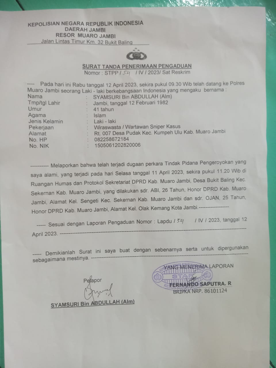 Akibat kejadian itu, korban didampingi sejumlah rekan seprofesinya kemudian membuat laporan polisi ke Sentra Pelayanan Kepolisian Terpadu Polres Muaro Jambi pada Rabu, 12 April 2023.
