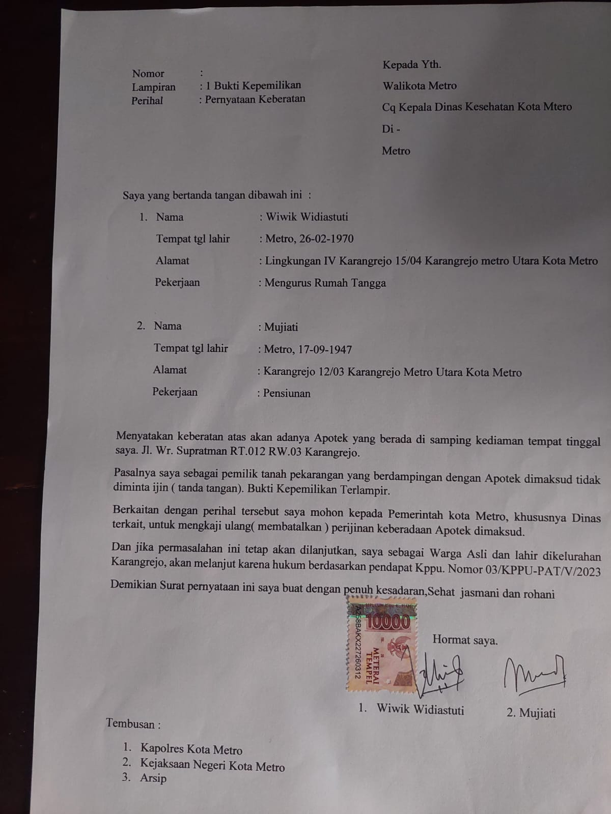 saya, berharap Pemerintah kota Metro dapat mengkaji ulang dan membatalkan terkait perijinan Apotek yang akan dibuka disebelah rumah saya ini, dan suya akan terus ikuti perkembangannya yang berdasar pada Pendapat KPPU nomor: 03/V / PAT- KPPU / 2023. Pungkasnya.